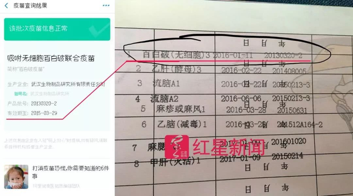 疫苗本显示批次为“20130320-2”的百白破疫苗接种日期为2016年1月11日,而据查询,该批次疫苗过期截止日期为2015年3月29日