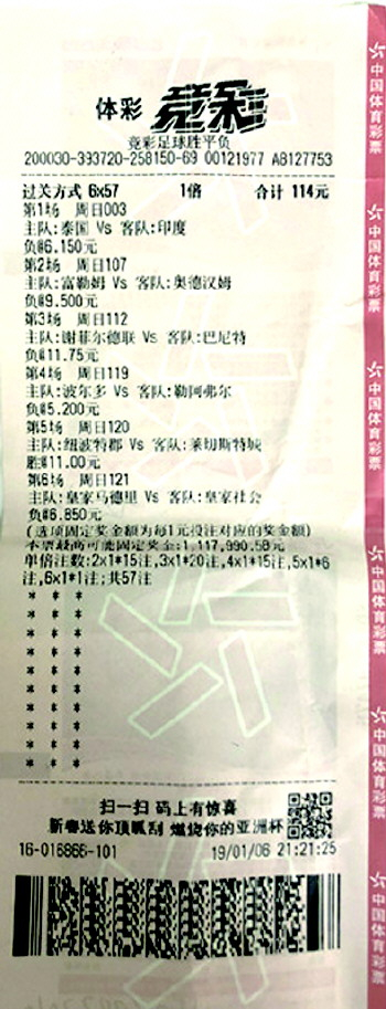 投注竞彩6串57“顺利过关” 山东泰安小伙新年伊始获奖百万