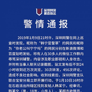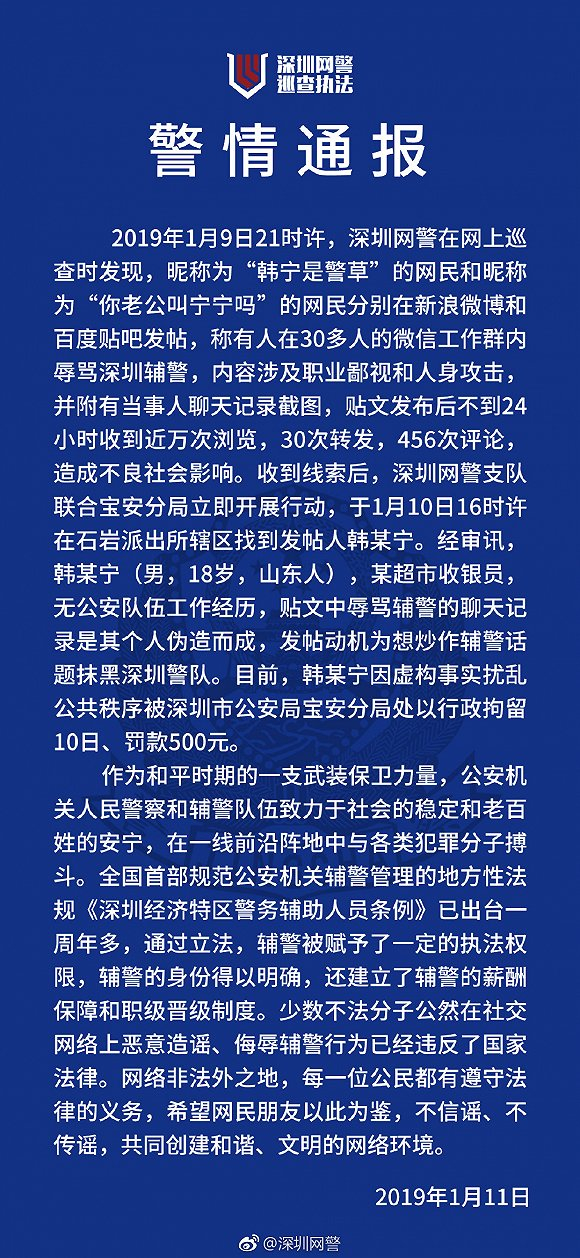 2019年1月9日21时许,深圳网警在网上巡查时发现,昵称为“韩宁是警草”的网民和昵称为“你老公叫宁宁吗”的网民分别在新浪微博和百度贴吧发帖,称有人在30多人的微信工作群内辱骂深圳辅警,内容涉及职业鄙视和人身攻击,并附有当事人聊天记录截图,贴文发布后不到24小时收到近万次浏览,30次转发,456次评论,造成不良社会影响。收到线索后,深圳网警支队联合宝安分局立即开展行动,于1月10日16时许在石岩派出所辖区找到发帖人韩某宁。经审讯,韩某宁(男,18岁,山东人),某超市收银员,无公安队伍工作经历,贴文中辱骂辅警的聊天记录是其个人伪造而成,发帖动机为想炒作辅警话题抹黑深圳警队。目前,韩某宁因虚构事实扰乱公共秩序被深圳市公安局宝安分局处以行政拘留10日、罚款500元。