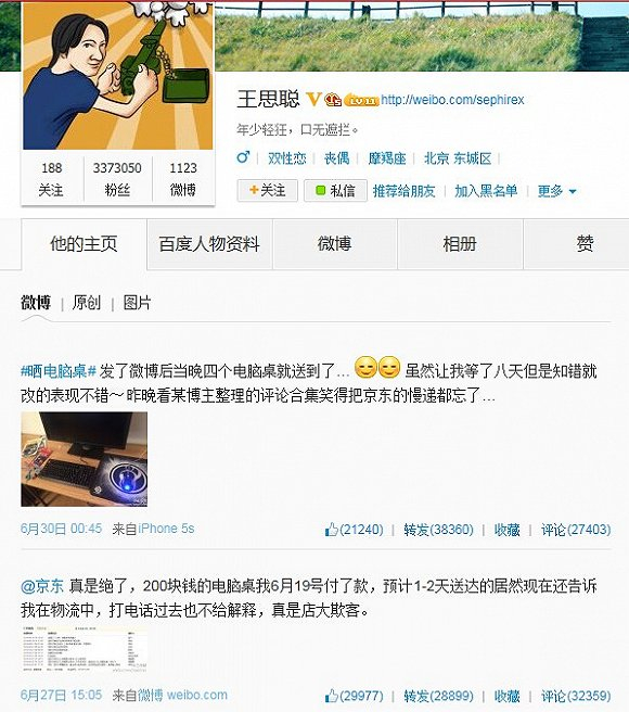 很多人说他是啃老富二代,这纯属吃不到葡萄说葡萄酸。王思聪最著名商业成就完全是自己闯出来的。2014年,他在微博上单挑电商巨头京东,投诉物流太慢,结果发微博后当晚就收到了四个电脑桌。