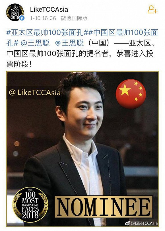亚太区最帅100张面孔正在投票阶段,评选方TC Candler日前在官方微博上陆续发布了提名者名单,在一票俊男美女的流量明星中,王思聪的上榜引起了网友的争议。