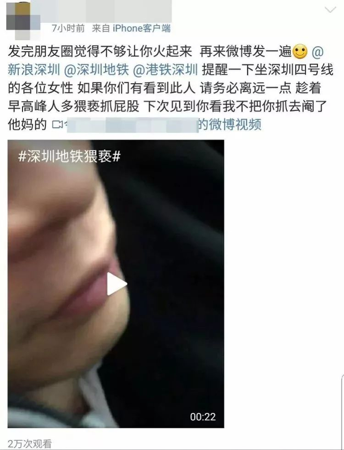 有微博网友发帖称,曝光深圳地铁4号线上有“咸猪手”,一男子趁着早高峰人多猥亵抓屁股,帖子还附有一段呵斥涉事男子的视频。
