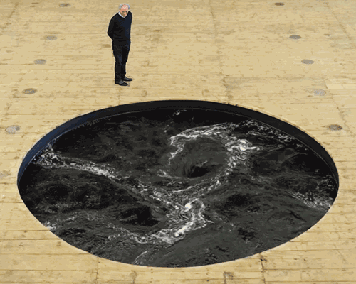 这个看似无底的水池,里面装满了用全天然的黑色染料染黑的水。水旋转成漩涡,然后在中心坍缩成深渊。此刻,安尼施·卡普尔创造出了一个神秘的精神空间,召唤观看者借助这件作品产生出源自于自我经验之上的体验和记忆。
