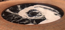 像卡普尔的所有作品一样,《下沉》是对材料和过程进行深入研究的结果,探索“水”以惊人的方式表现出的潜力。圆形水池里的黑水在池中连续旋转运动后聚在一个中心涡流中,似乎要被吸入地球的深处。