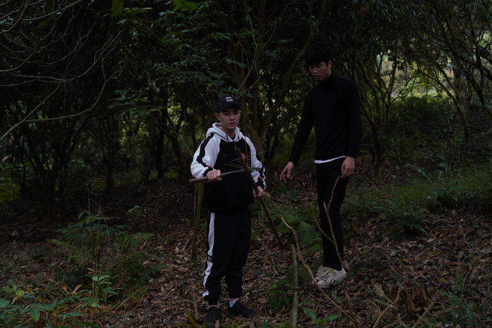 团队成员河振在山上砍竹子,这根竹子被用来做二郎神的武器主体。河阵说自己从小就在农村长大,对这些农活都很熟悉,以前就经常干。