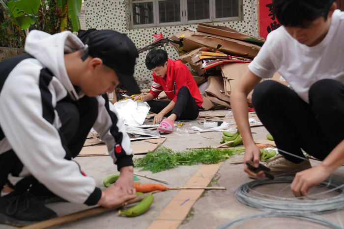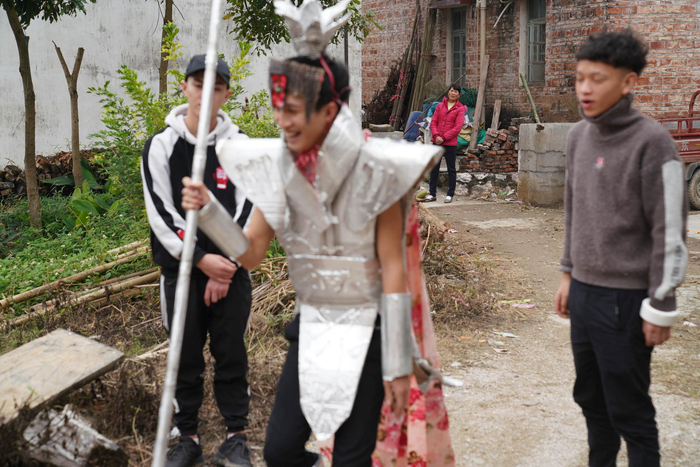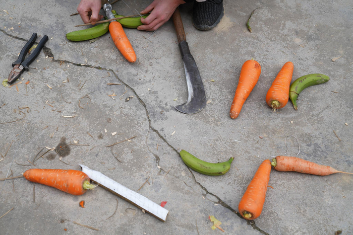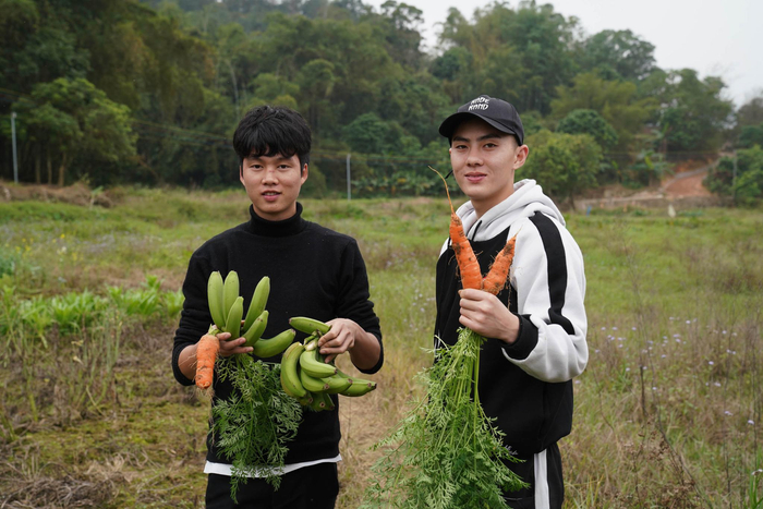 河振和小智在挖红萝卜。小智是村里本地人,这地里的红萝卜是他自家的,如果是别人家的,他们会向村民购买。为了保持原创性,制作的服装道具能在村里找到的东西就在村里,找不到的东西就上网买。虽然预算极其有限,但他们会想各种办法。这些在地里收割的香蕉和红萝卜,用来安装在二郎神的武器上面。这对于很多粉丝来说,简直是脑洞大开。