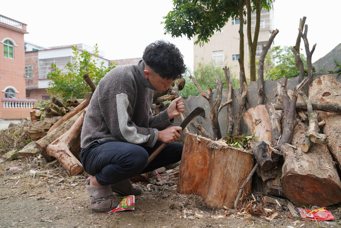 团队另外一名成员小黑正在削木头。整个团队已经形成一种默契,大家都会在细节上用心,做到精益求精。