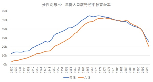 一,1980年以前出生的人口,无论是男性(蓝线)还是女性(橙线),能获得大学教育的比例都在10%以下。而且女性获得本科教育的比例也总是比男性更低。
