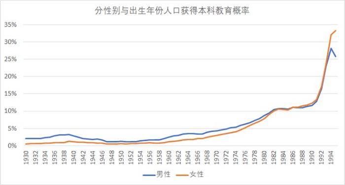 三,从1991年开始,一切都改变了。仅仅5年,1995年出生的女性获得本科教育的概率就上升到33%,且已经开始甩开同龄男性仅为26%的本科教育概率。