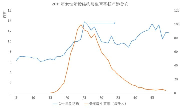 且育龄女性峰值——1990年出生的女性人口——开始逐渐远离生育率峰值(26岁),生育数量减少也就成了必然。