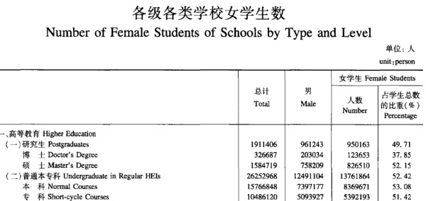 这更容易理解,我们看2015年的《中国教育统计年鉴》其中的第7页,各级各类学校女学生数,他的本科生中,男生数量比女生数量是88:100。