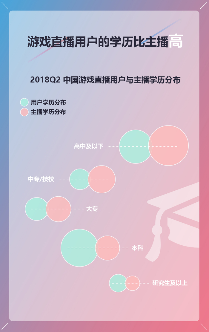 2017年腾讯研究院的一份针对4500名直播主播的调研显示,高中学历占比32%,大专学历占比24%,初中学历占比23%,本科学历占比15%,硕士学历、博士学历分别占比2%和1%。