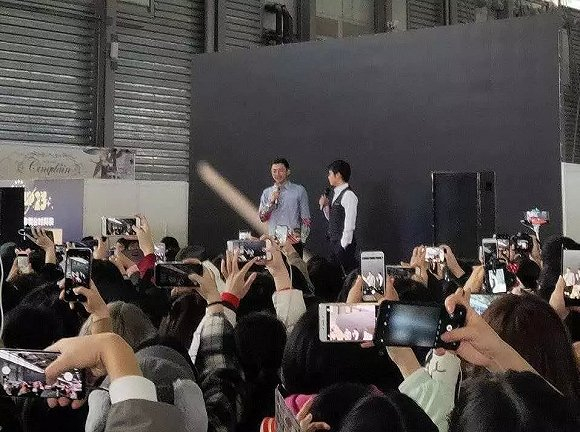 刘琮(左)、杨天翔两位声优主办方显然低估了他们的人气,现场有些失控,出于安全考虑,两位声优只上台互动了两分钟便匆匆离开,主办方临时取消了见面会。而现场的粉丝有的买了高价黄牛票、有的千里赴约、有的早上五六点开始露天排队,有的连续站立3个多小时,都想离主舞台再近一点。