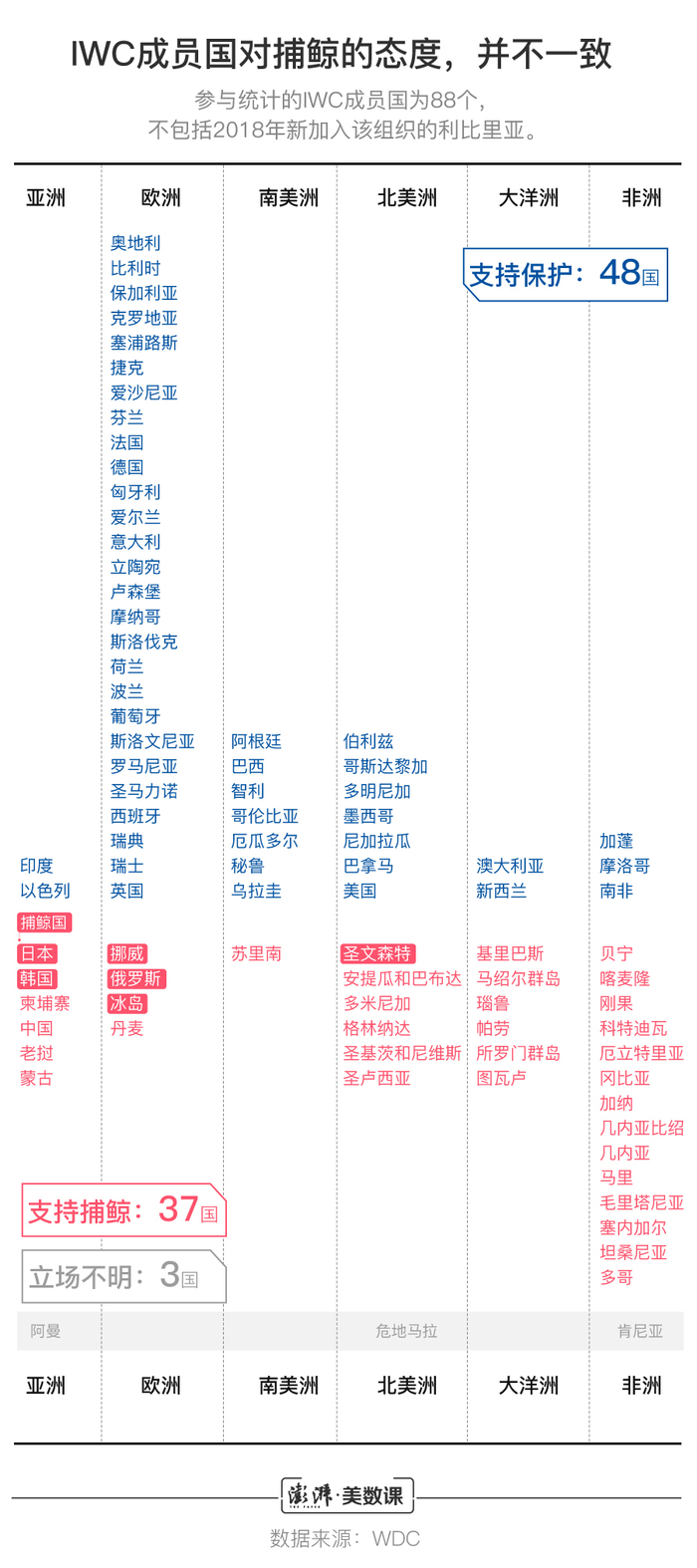 而日本,并不是唯一出于利益需求无法放弃捕鲸的国家。尽管在IWC内部,反对捕鲸的国家仍多于支持捕鲸的成员国,但前者并没有形成绝对优势。
