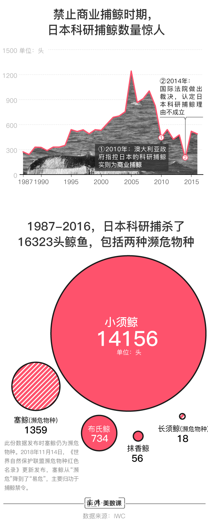 如果从日本对捕鲸一贯的执着程度来看,这种做法是可以预料的。尽管IWC在1986年正式推动了《全球禁止捕鲸公约》的生效、严禁商业捕鲸,但日本每年仍以科研名义捕杀多种鲸鱼,其中包括当时被列为濒危物种的长须鲸和塞鲸。