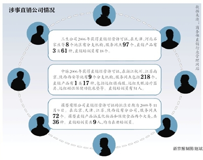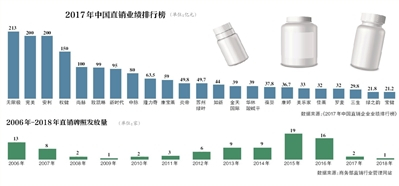 记者注意到,这些直销公司的产品多以保健品为主。根据公司官网,南京中脉始创于1993年,服务经营范围包括医疗器械生产、保健食品生产、直销经营等。三生(中国)健康产业有限公司成立于2004年,从事健康产业,经营范围包括生物制品、日化产品的研究、开发,服装、服饰等。在2017年美国直销网站DSN发布的全球直销企业100强榜单中,三生位列34位。该网站统计的数据称,三生公司2017年业绩为6.96亿元,同比增长118.75%。