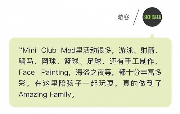 针对最后一个因素,卫生、安全、饮食和室内设施的配置上,Club Med作为一个度假村,当然并不难满足。特别是针对年龄偏小的孩子们,房间内的bb床;餐厅里的儿童座椅和儿童专用餐具,餐点上一些食用的果泥、果汁,酸奶等辅食都一应俱全。做到这些并不难,但要做到有亮点,还需很长一段路要走。