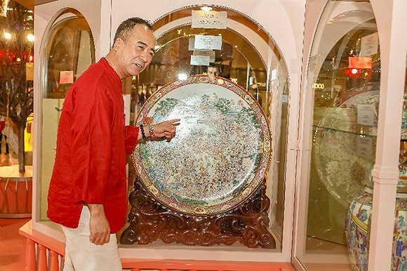 谭广辉大师现场展示其广彩作品《百子百美图》现场展出广东知名藏家的广彩家珍活动现场,谭广辉大师开设广彩工作坊,让来宾体验从起稿、描线、上色到织金的广彩技艺