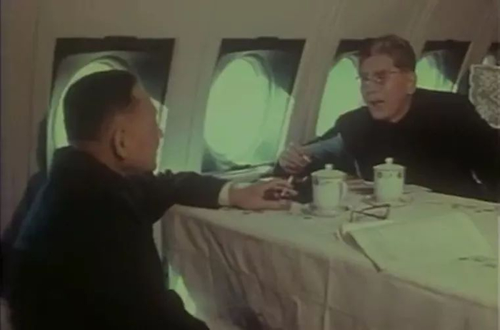 图:邓小平在出访的专机上,前排右一为时任民航北京管理局局长徐柏林