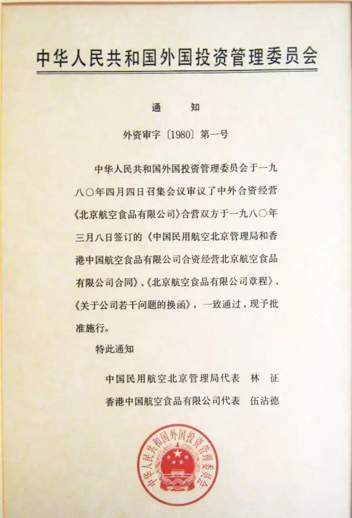 北京航空食品公司,中国大陆第一家合资公司001号,在1980年5月1日在北京成立,中国民航北京管理局,出资300万元,占股51%;香港伍沾德先生为代表的中国航空食品有限公司,出资288万元,占股49%。