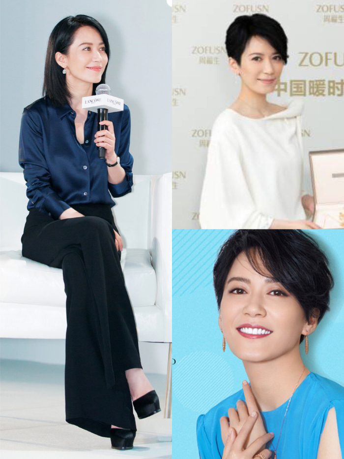 剪了短发有点悲剧的还有“女神”俞飞鸿。今年已经48岁的她一直走优雅端庄路线,保养得宜的面容,深居简出的行事作风,使她一直保持着低调的神秘感。然而此前突然因与某珠宝品牌签约代言而放出的一组短发照则让网友们大跌眼镜。女神不仅剪去了一头长发,鬓角还推到了耳朵以上,活脱一个男人头,吹得蓬松隆起的发型更被吐槽为“80年代港风老阿姨即视感”。
