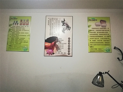 理疗店墙上挂着的生物电宣传内容,称其可疏通经络、治疗宫寒等。