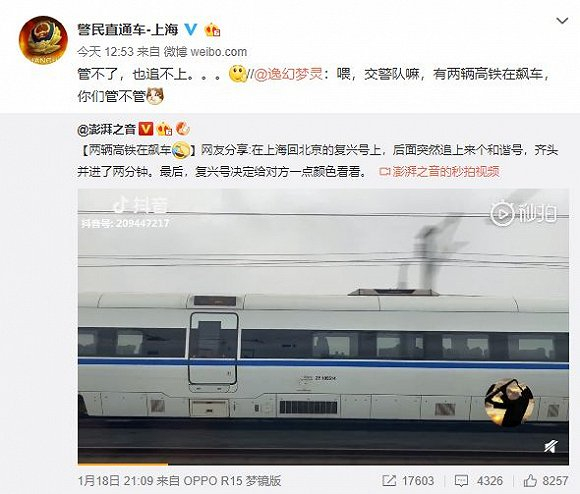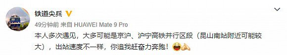 铁路局工作人员进一步解释,两辆车可能是南京南开出,复兴号走京沪线限速350公里每小时,和谐号开往合肥方向限速250公里每小时,这一段路刚好是两个线路并线,可能复兴号启动晚,或者是在等加速信号,一开始速度慢,加速后自然就超过和谐号了。