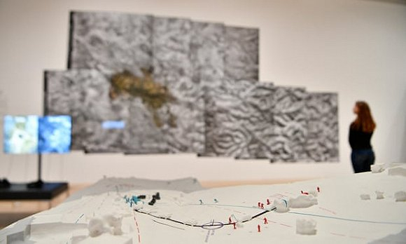 这不是那种摆在收藏者家里的艺术,不是赏心悦目的绘画,甚至不是艺术家的自我表达。研究建筑中心的学生和教职工正满怀激情,对抗着带来暴力与破坏的权力结构,运用各种纪实的、科学的手段,揭露不为人知的故事。他们将自己称为“空间实践者”,而不是建筑师或是艺术家,因为在美术馆里展出的影像片段、图片、装置和书籍作品只不过是他们工作的一部分。除此之外,他们还有教学工作,与专家合作,继续进行手头上的研究。不管是调查全球气候变暖对阿拉斯加“气候移民”群体的威胁,还是澳大利亚移民法案违反人权法的指控,他们的目标都是影响政治风向。