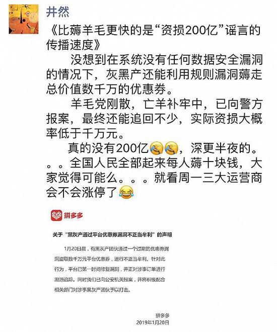 拼多多市场部负责人井然在朋友圈表示,损失金额没有200亿之多,实际资损大概低于千万元。他还表示,比薅羊毛更快的是“资损200亿“谣言的传播速度。