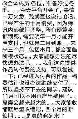 除了行业曝出的拖欠稿费事件,让漫画作者群体炸开锅的是2018年10月底传出的一则聊天记录截图。截图内容大致是:因腾讯内部部门调整,所有预算锁死,需要2019年1月才能开启支付,也就是2019年2月到账。