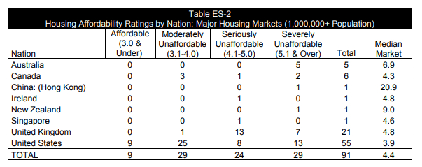 Demographia的调查覆盖澳大利亚、加拿大、英国和美国等八个国家的309个大城市的楼市,调查时间为截至2018年第三季度。有29个主要楼市被列为“严重无法负担”。