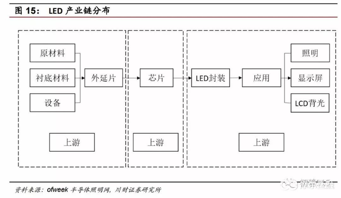 上下游情况如下图,芯片上游是硅片等材料,相对比较集中。比如三安光电2017年年报披露,前五名供应商采购额 310,612.97 万元,占年度采购总额 48.53%,相对集中。而下游是LED封装企业,A股上市的LED封装企业就高达10家左右,相对比较分散。