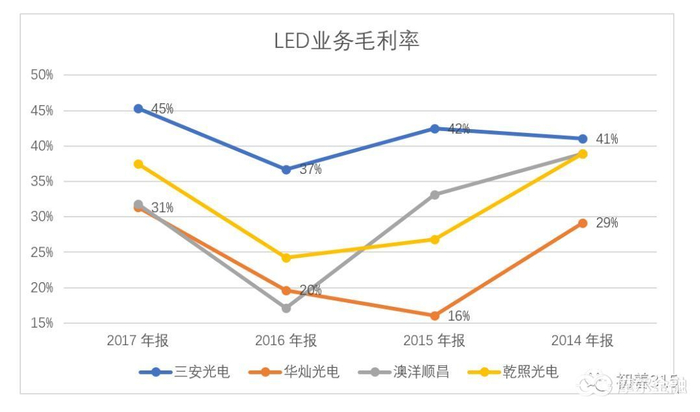 2、如何做到高毛利率在对比毛利率时,一定要考虑是同样的产品或者服务,不能直接拿公司的毛利率就对比,毕竟除了LED芯片,澳洋顺昌还有锂电池、钢板等业务等,因此尽量使用同业务的毛利率,因此本文选取下述公司的数据均为LED芯片毛利率数据。