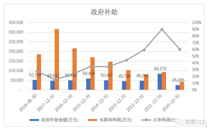 三是政府补助。三安光电一直以来拿到的政府补助就多的吓人,从2010年至今八年时间,政府补助超过46亿元,尤其是2015年之前,政府补助占净利润的比例均超过50%,是一头彻底的补助怪兽。至于为什么会有这么高的补助,大家可以查查安徽省长王的故事。