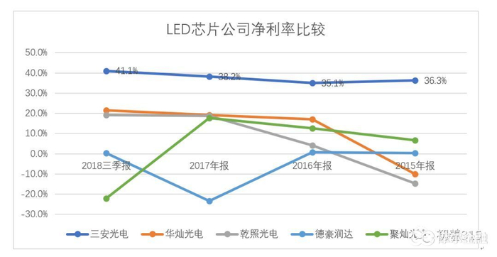 让大家感受一下,什么叫一枝独秀,金鸡独立。对比其他同是LED芯片的公司,三安光电的净利率就是跟假的一样。2015年至今,优秀的无话可说,净利率约40%左右,堪比茅台。可是这只是LED芯片行业啊。