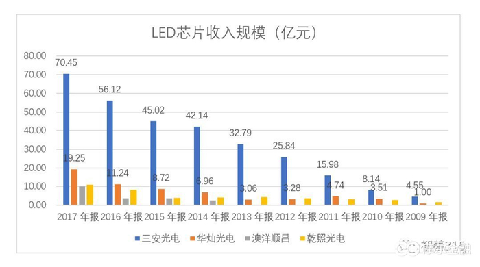 而针对LED芯片行业,三安光电是行业龙头,但是华灿光电、澳洋顺昌等规模也不小,算是集中度相对高的行业了。