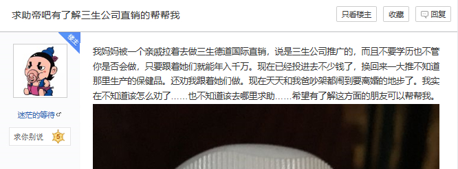 网友在百度帖吧发布求助帖,称其母亲陷入三生传销