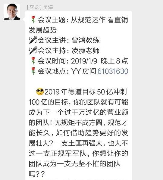2019年1月9日,王芳的教练曾鸿在YY直播做了《从规范运作 看直销发展趋势》的分享,他反复强调,商品实物是合规的关键,收会费要配以等值的公司产品,否则就成了资金盘。和其他老师一样,曾鸿并没有在商务部备案为直销培训员。
