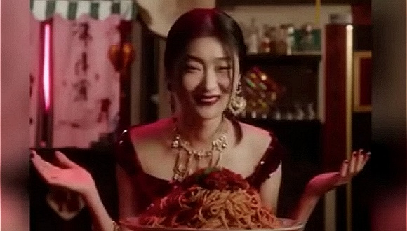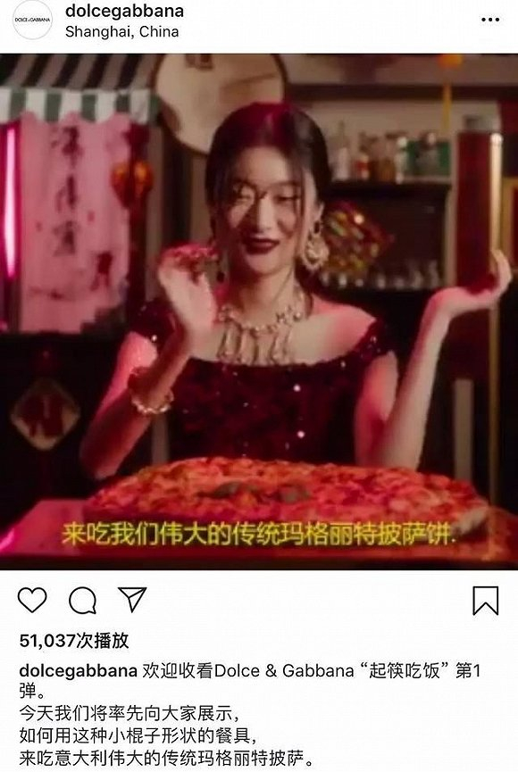 为了给上海大秀造势宣传,Dolce & Gabbana在秀前两天发布了三则简短的“起筷吃饭”广告。视频中,一位穿着Dolce & Gabbana的中国女孩坐在中国餐馆里,尝试用筷子品尝超大尺码的三种意大利美食。