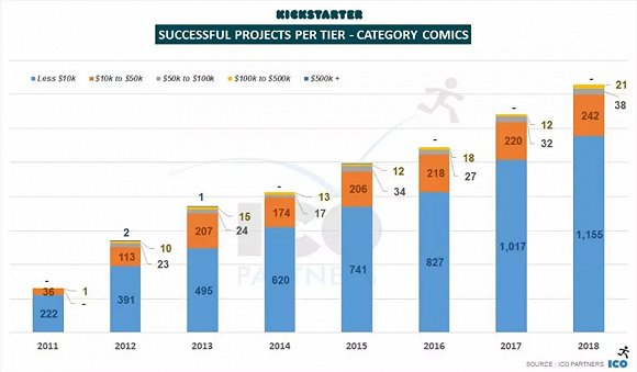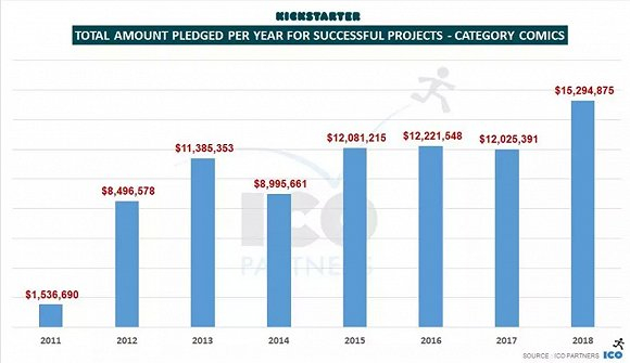 2018年,漫画类在Kickstarter上实现了高速发展。根据ICO Partners发布的数据,2018年共有1456个项目筹集资金成功,共达1530万美元。与2017年的1200万美元相比,增幅为27.5%,创下该类别的筹金总额历史记录。
