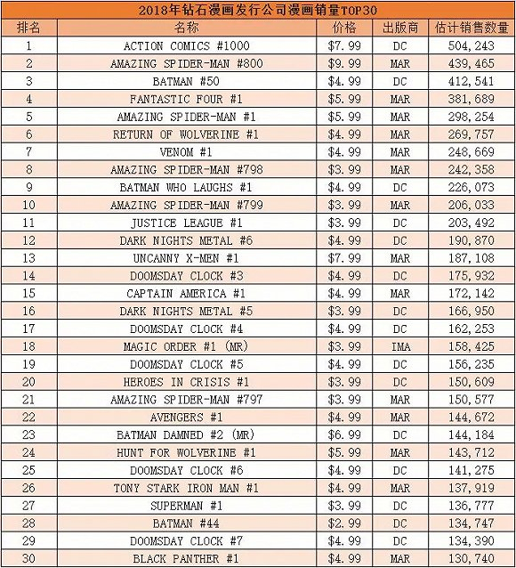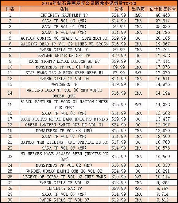 而Diamond在本月也陆续公布了2018年畅销漫画榜和畅销图像小说榜。