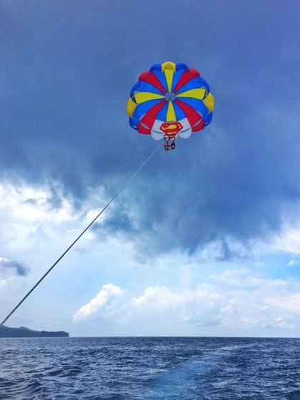 背上和快艇相连的降落伞,利用快艇快速前行的动力,将你缓缓带上空中。头顶的降落伞像朵巨大的五彩蘑菇云,脚下的大海则似个安静而迷人的姑娘,阳光洒在背上,微风拂过脸庞,空气中弥漫着夏日海的气息。这种悠悠扬扬,飘在海上的浪漫,大约若干年后我还会记得吧。