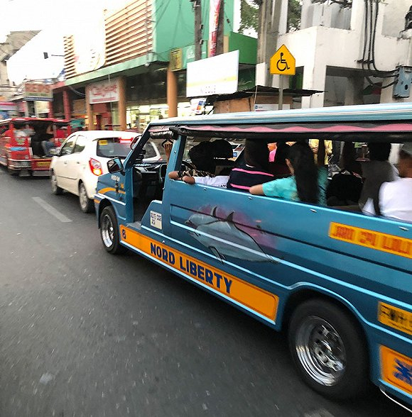 这是菲律宾最酷、也最普遍的一种交通工具,没有车门和玻璃车窗,乘客面对面排排坐,路线固定,随招随停,每趟20比索左右。