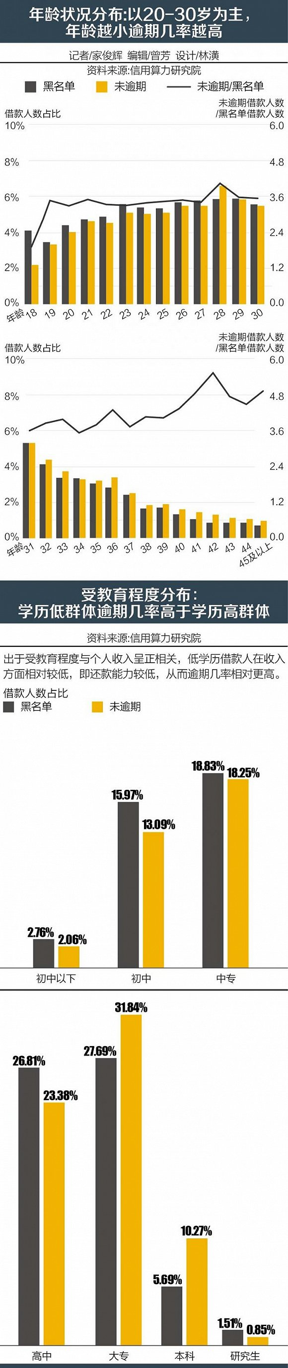 《报告》分析显示,多数借款人年龄在20-30岁之间,且呈现年纪越小,逾期几率越高的现象,一个重要原因是很多年纪较低的年轻人在缺乏稳定较高收入的情况下,过度超前消费提升生活品质,导致自己还不起钱背负一身债,最终纳入黑名单。