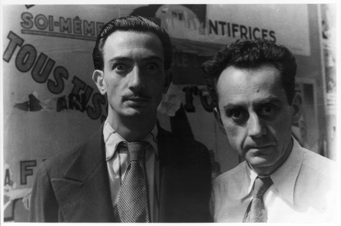 1934年在巴黎的达利与美国现代主义艺术家曼·雷。这一年对于达利来说是一个重大的转折点,他在巴黎办了个展,又跟超现实主义运动宣告决裂。与此同时,他不顾父亲的反对,与大自己十岁的喀山女人加拉完婚。