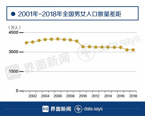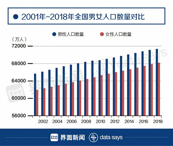经历了总人口性别比连续13年下降后,到2018年中国男性人口仍然比女性人口多出3164万人。这将使得“剩男”问题继续困扰国内人口政策的制定者。