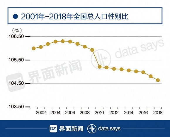 实际上,据界面新闻根据国家统计局网站数据统计,自2006年以来,我国总人口男女比例已连续13年下降,此前在2005年,这个数据曾达到106.30,从2006年开始呈现逐年递减趋势。