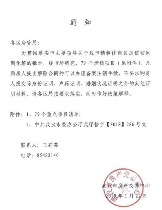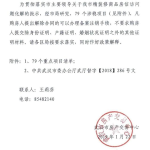 1月22日,网上流传一份由武汉市房产交易中心发布的通知,据称,为贯彻落实武汉市主要领导关于武汉市精装修商品房信访问题化解的批示,经市局研究,79个涉稳项目,凡购房人提出解除合同的可以办理备案注销手续,不要求购房人提交除身份证明、户籍证明、婚姻状况证明之外的其他证明材料。