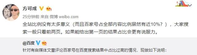 百度回应后,“搜索引擎百度已死”文章作者方可成认为:全站比例没有太多意义,大家搜索一般只看前两页,如果能给出第一页的结果占比会更有说服力。