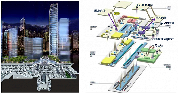 如前文所述,TOD是以公共交通为导向的城市发展模式,因此公共交通在TOD当中扮演着十分关键的地位。九龙站以港铁开发的车站综合体为区域核心,综合体采用三维的立体化城市设计,各类建筑建在交通枢纽核心之上,分类布局,共享同一个基座,不同性质交通的垂直向分层和水平分区,巴士站点藏匿在大楼底下,不影响城市界面的连续性,减少噪音和污染。